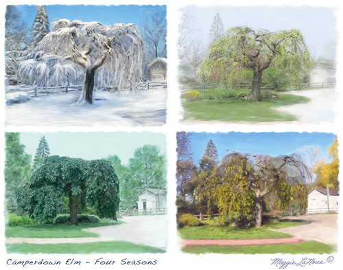 This Camperdown Elm, located in the back yard of Albion Heritage Bed and Breakfast in Albion Michigan was painted in all four seasons by Michigan artist Maggie LaNoue.