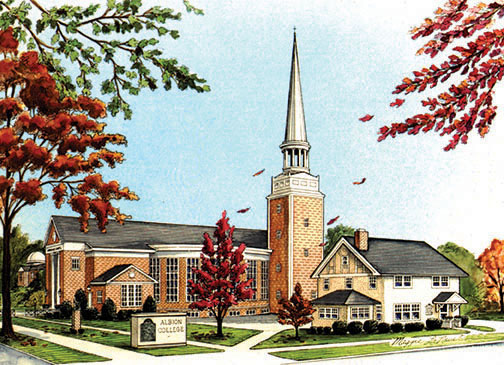 When the building was complete in 1958, the local Methodist congregation met for the last time at the Erie St. Church, had a brief prayer service then marched to the new location for a dedication service. The sanctuary seats over 1,400 people. The building also houses the college Music Department.