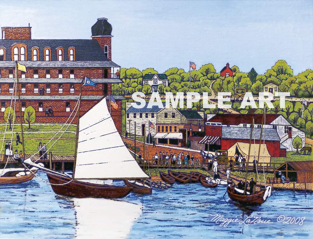 Harbor Springs is in a sheltered bay on the north shore of the Little Traverse Bay on Lake Michigan. Founded by the Jesuits, Harbor Springs was once called L’Arbre Croche, which means “Crooked Tree”. Historical Harbor art is an oil painting by Maggie LaNoue based on a historical black and white photo of Harbor Springs Michigan.