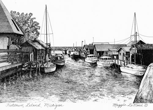 Fishtown is a collection of weathered fishing shanties, smokehouses, overhanging docks, fish tugs and charter boats along the Leland River in Leland, Michigan.